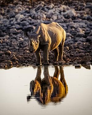 A single rhino reflecting at a watering hole in Namibia - July 2019