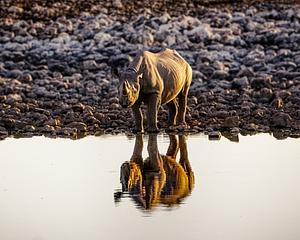 A single rhino reflecting at a watering hole in Namibia - July 2019